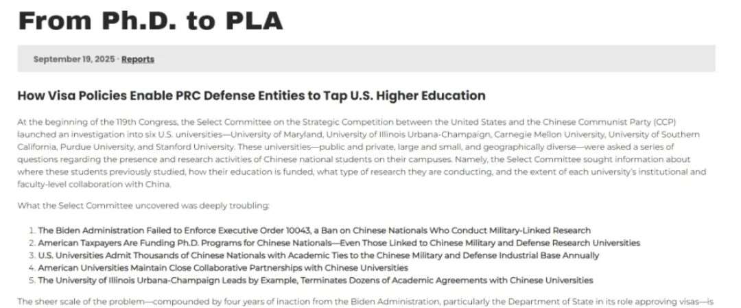 9月19日,美国国会众议院下属的“美中战略竞争特别委员会”发布了一份重磅报告,题为《从博士到解放军:签证政策如何让中国国防实体利用美国高等教育》。