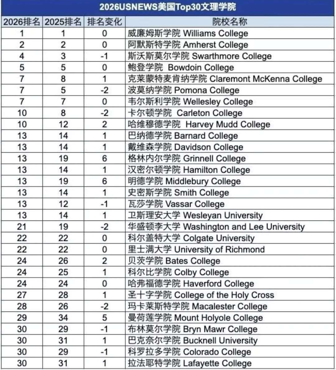 同时U.S.News也发布了2026年全美*佳文理学院排名。今年大地震,只有4所院校排名没有变化,看点满满!